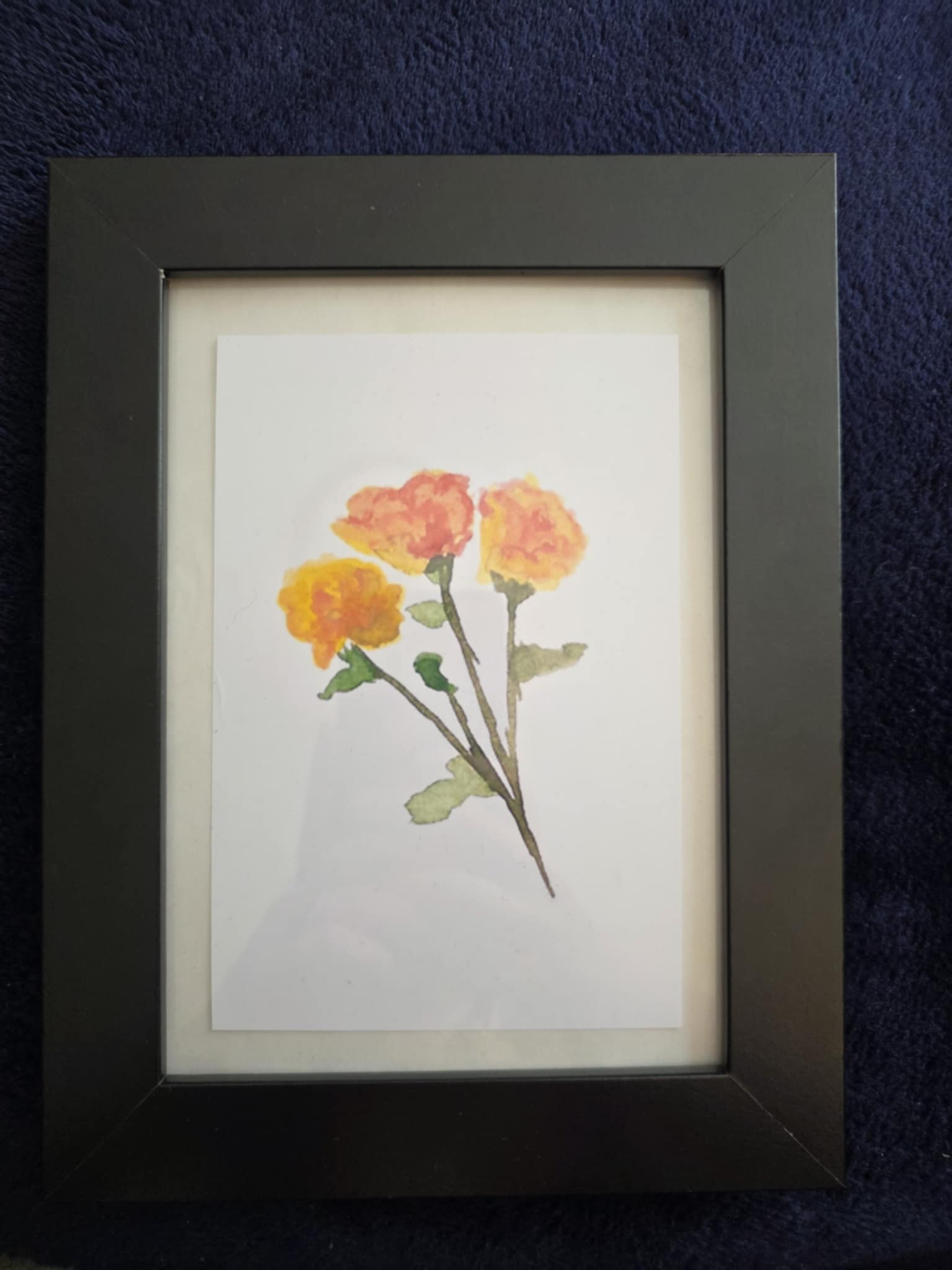 'Yellow Orange Roses is a small watercolour of a bunch of roses I created towards the end of summer in 2024. The size is roughly A6 on photo paper. I drew this on a sunny afternoon at my local Rose Park in the East End of Glasgow, Scotland, where I grew up. The Item is not sold with a Frame.